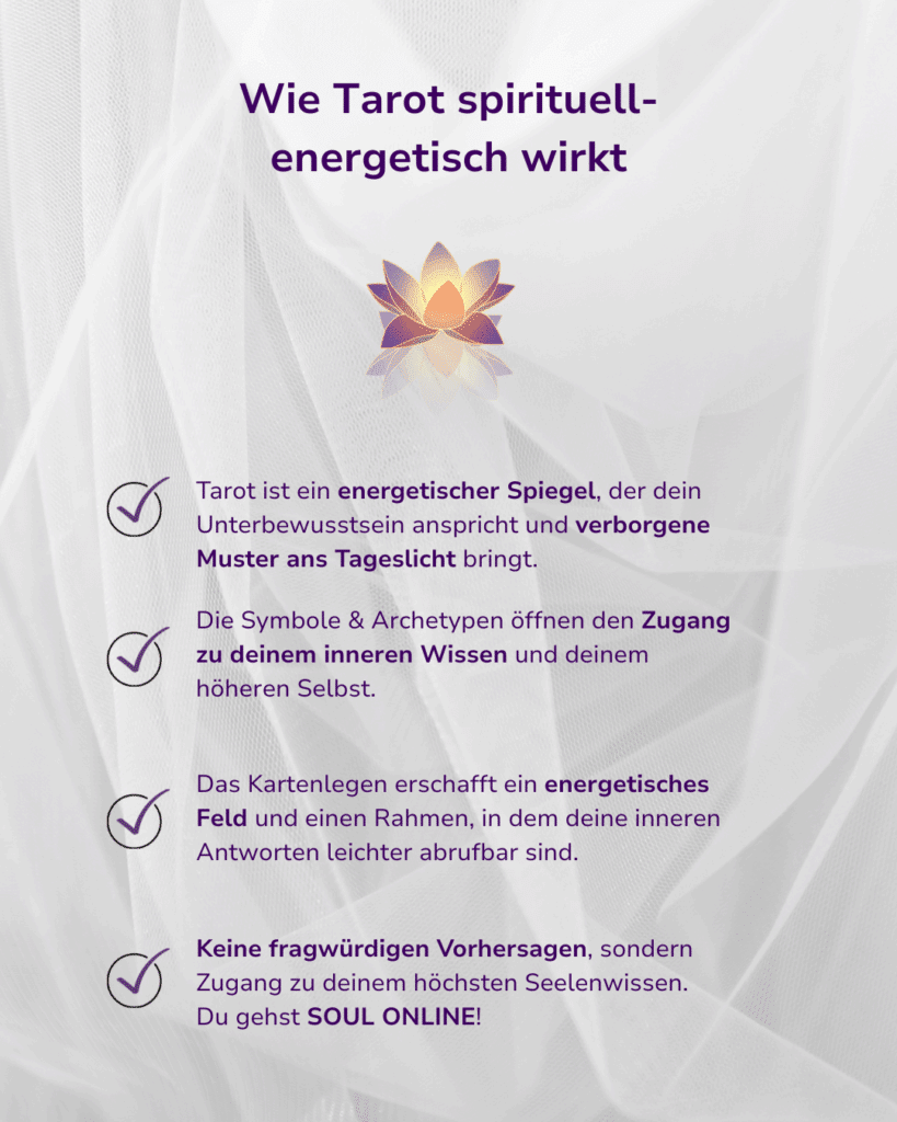 Bei Tarot Inner Work geht es nicht um Zukunftsvorhersagen, sondern um innere Klarheit, Mustererkennung und Selbststärkung.