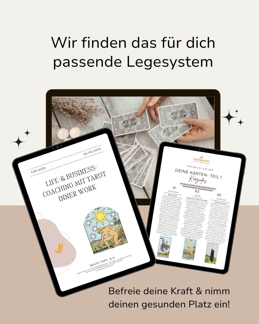- Deine persönliche große Tarotlegung zu einem Lebensthema (z. B. Entscheidungen, Beruf, Beziehung, Gesundheit, Lebenszyklen)